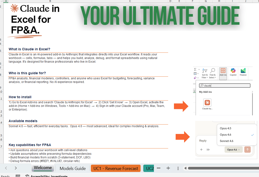 No AI experience required. Just download, open in Excel, install the Claude add-in, and start transforming your FP&A workflows today.